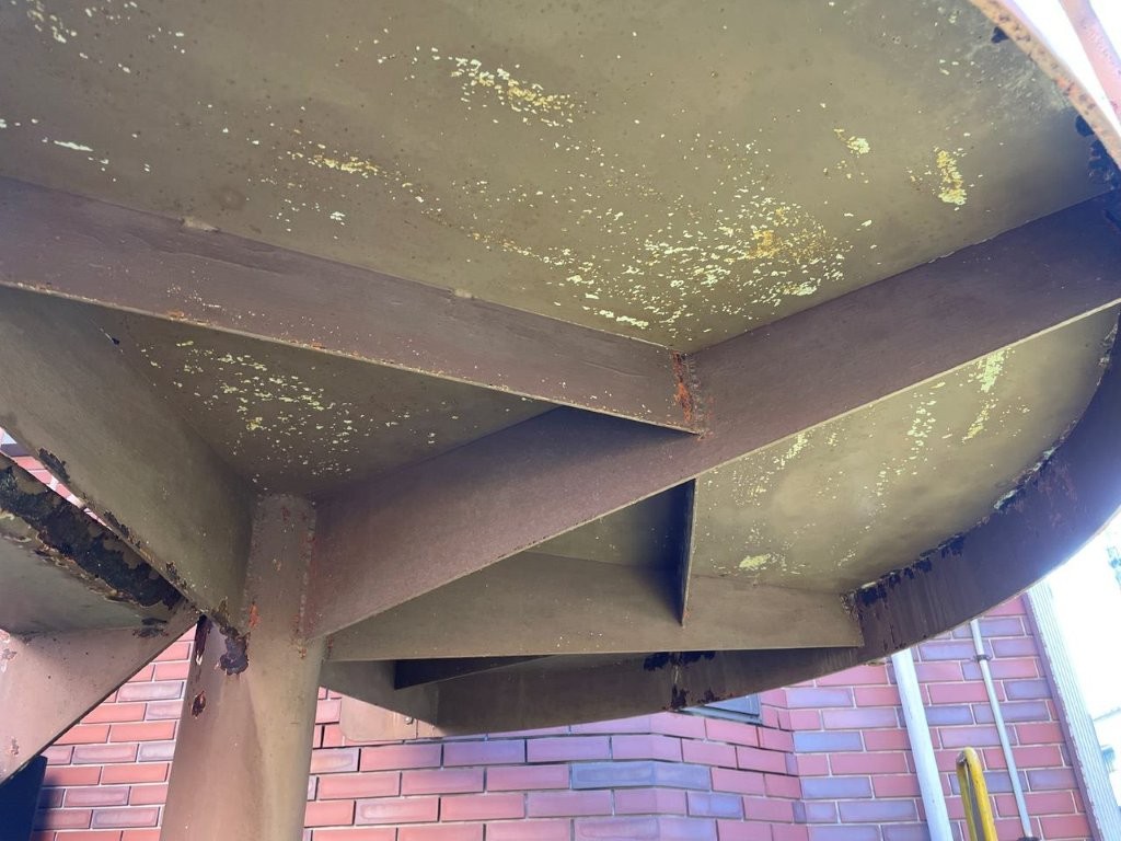 | ご提案内容 | 外階段はアパートの外観に大きく影響し、当然ながら入居率にも関連するため、塗装が剥がれたりサビだらけの階段では入居者に悪い印象を与えかねません。 今回は経年の劣化により至る個所に錆が見受けられましたが、古い塗装が剥がれると、階段表面がツルツルになり滑りやすくなります。 上記の諸々の状況を鑑み、今回は紫外線や雨風に強く、親水性の塗膜で雨水とともに汚れが流れ落ちやすくなる特徴を持った塗料、日本ペイント社の「ファインシリコンフレッシュ」を採用。 耐久性・低汚染性、そしてコスパの良さを兼ね備えたシリコン塗料で、外壁や鉄部の塗装に最適です。 安全性や耐久性の向上、そして物件価値の維持を兼ね備えた外階段の塗装工事です。 |