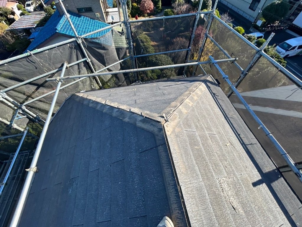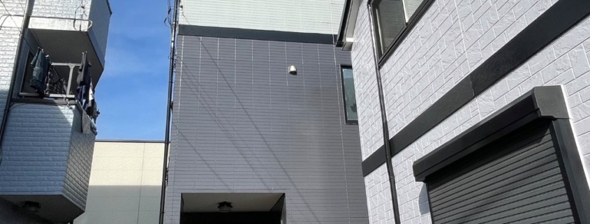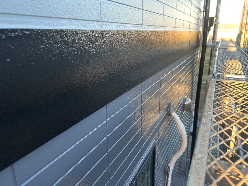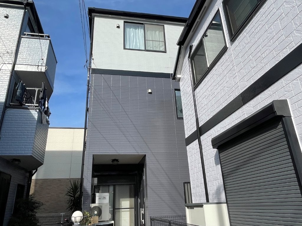 | 使用商材 | 【外壁1F】サーモアイSi(クールダークグレー) 【外壁2F】水性サーモアイウォールSi(ND-401) 【シーリング】ボンドMSシールNB 【付帯部】ファインパーフェクトトップ(ブラック) 【ベランダ防水トップ】スーパートップ遮熱 【屋根材】ガルバリウム鋼板屋根材(縦葺き/棟板金新設) |