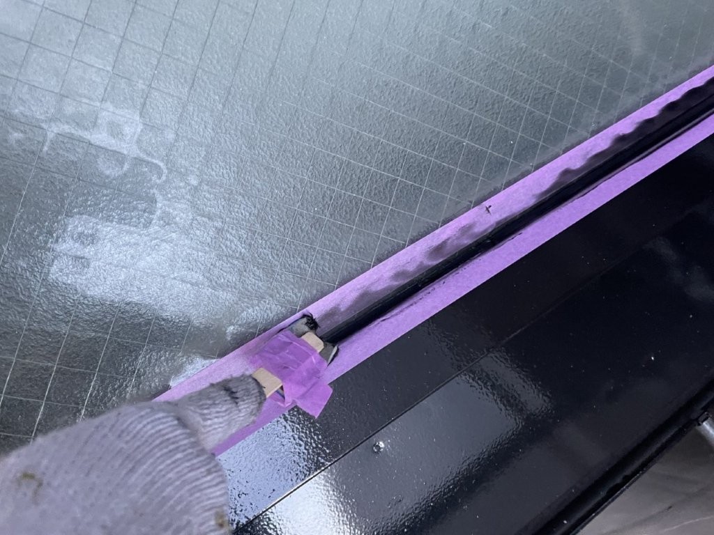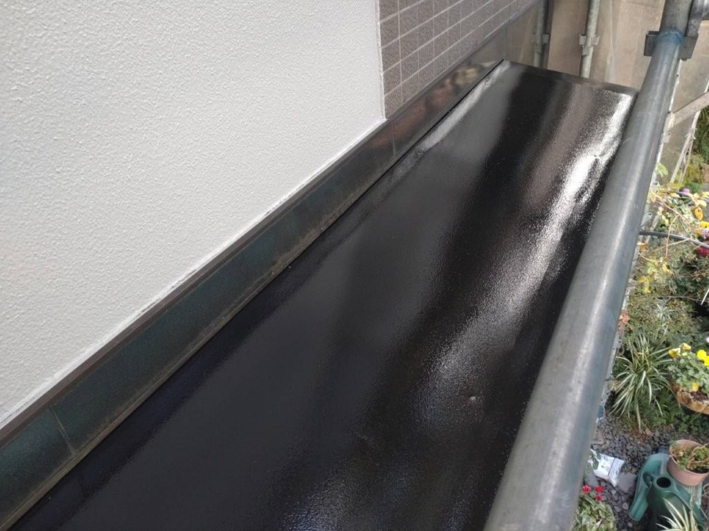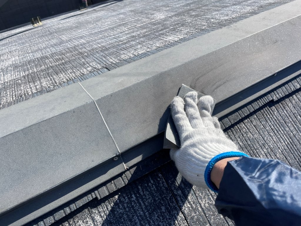 マスキング養生後、均一に充填しヘラで丁寧に押さえ、防水ラインを再構築。塗装前に確実な防水処理を施すことで、長期耐久性を確保します。