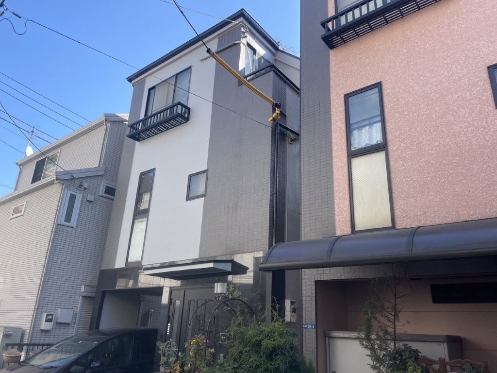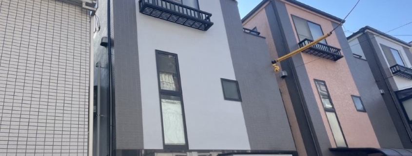 東京都江東区亀戸にて、築およそ12年の3階建て都市型狭小住宅の外壁塗装・屋根塗装工事を行いました。