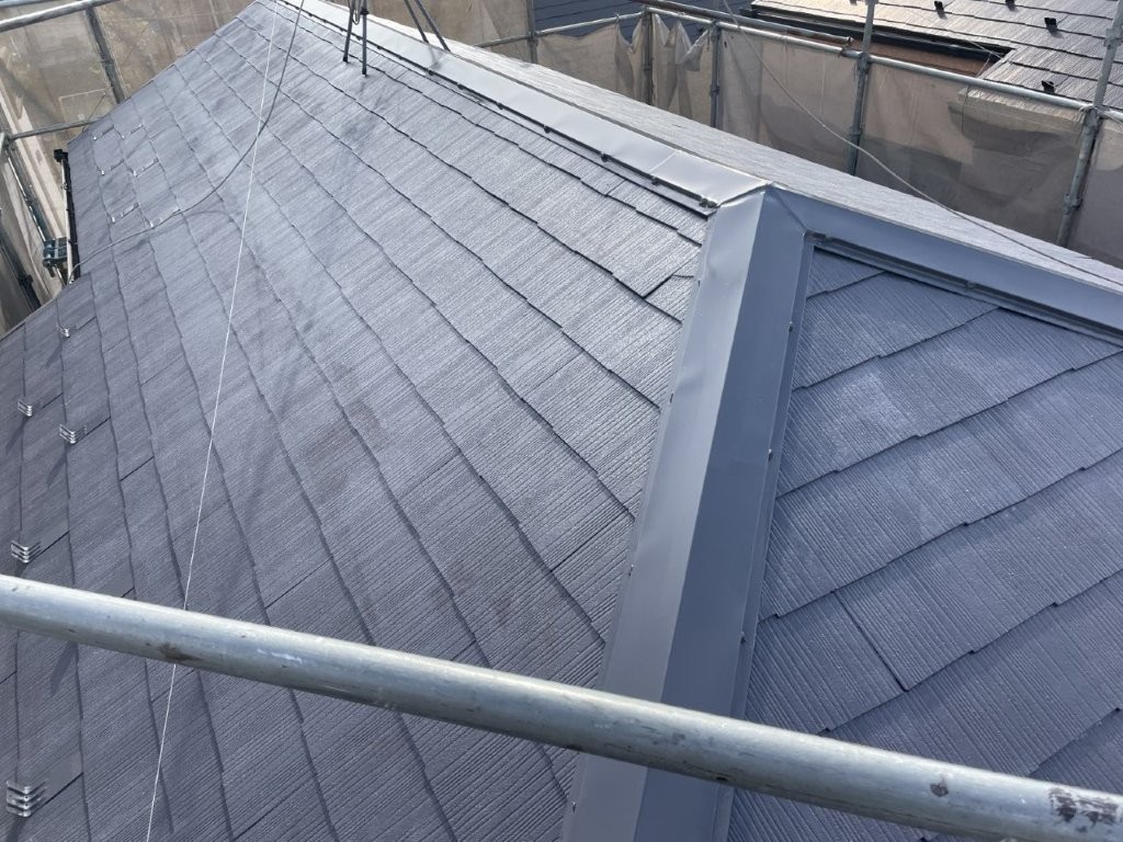 クールダークグレー仕上げにより、外観を引き締めつつ、夏場の屋根表面温度上昇を抑制。3階建て都市型住宅に適した機能的施工です。