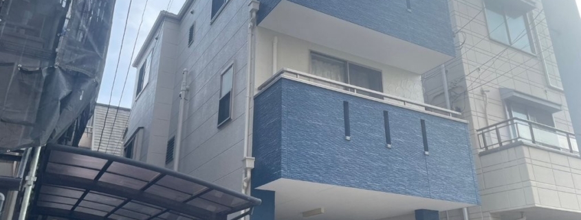 【東京都江戸川区】3階建て戸建ての外壁塗装・屋根カバー工法|ブルー・ホワイトのツートン施工事例