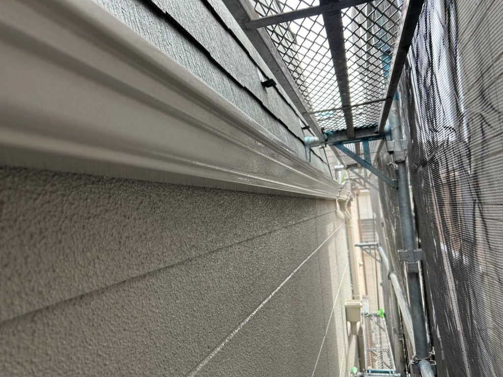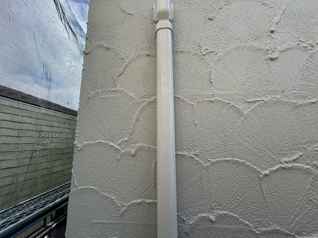 シャッターボックス、雨樋、竪樋、水切り、軒天、配管などを、各部ケレン後に下塗り+上塗りで丁寧に仕上げました。 細部が整うことで、外観全体の統一感と高級感が一段と向上します。