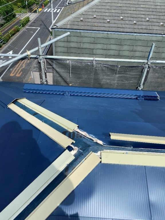 その上に新規金属屋根材を設置し、棟板金新設・換気部材設置まで実施しました。